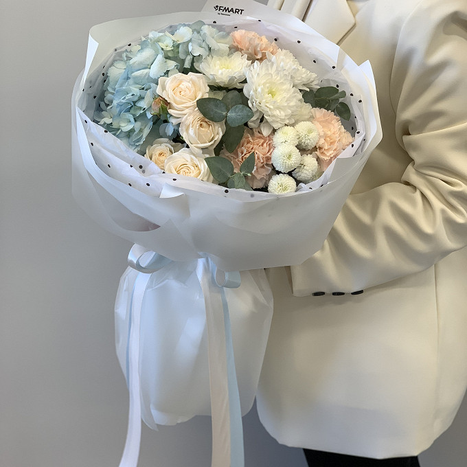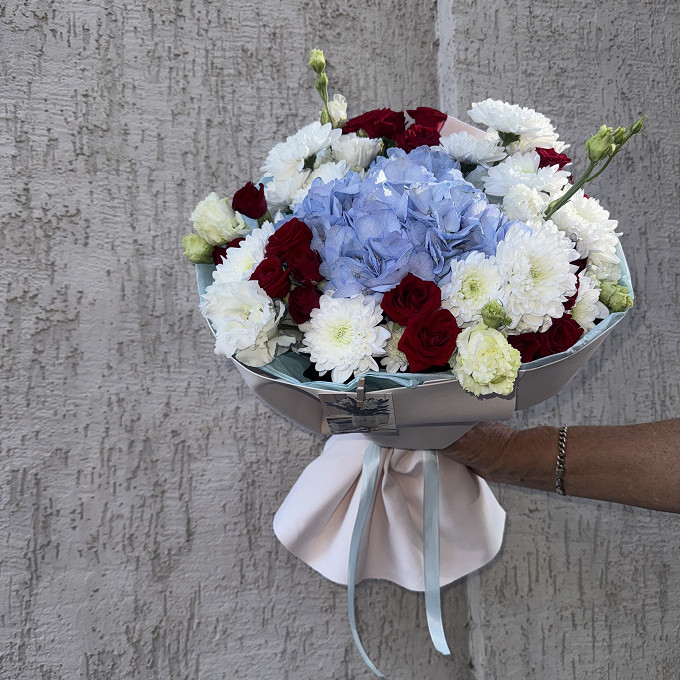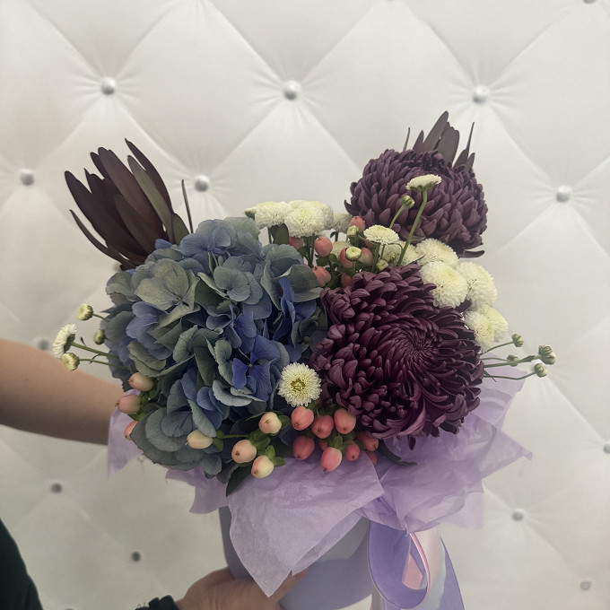 Букет из голубой гортензии и хризантемы