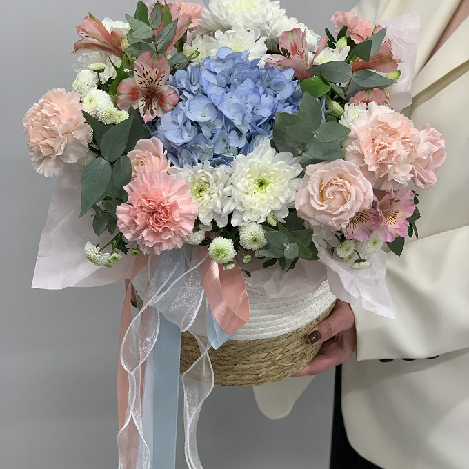 Корзина со свежими цветами (голубая гортензия)