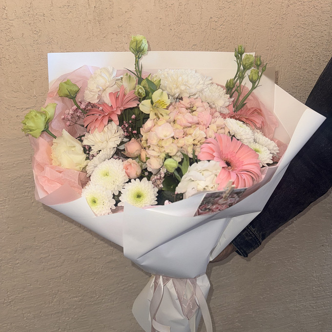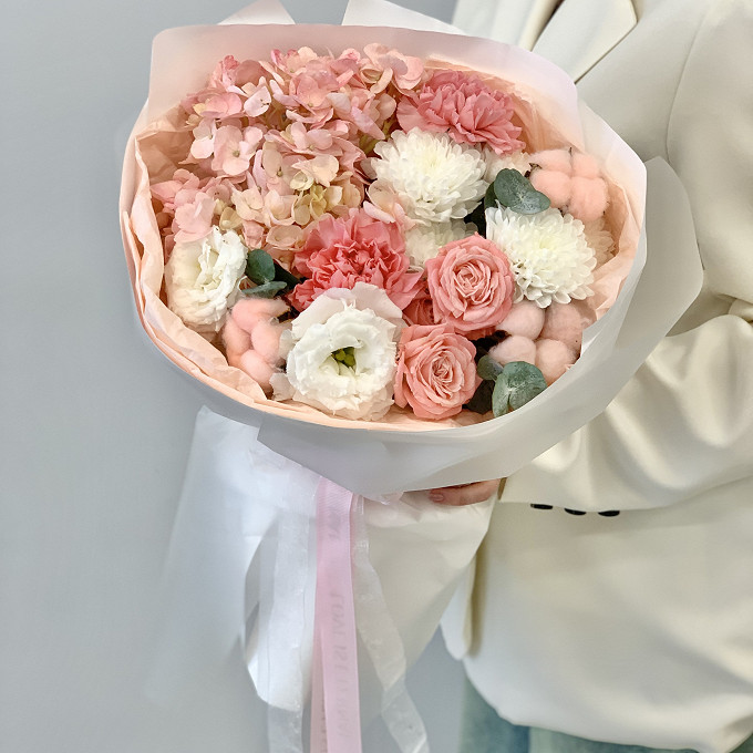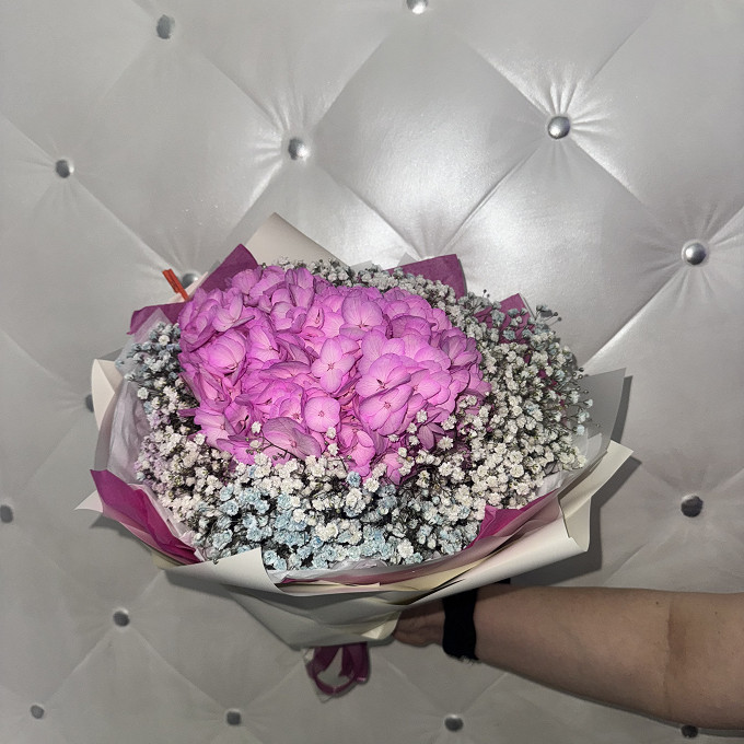 Букет из розовой гортензии и хризантемы