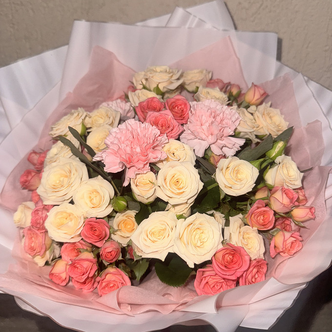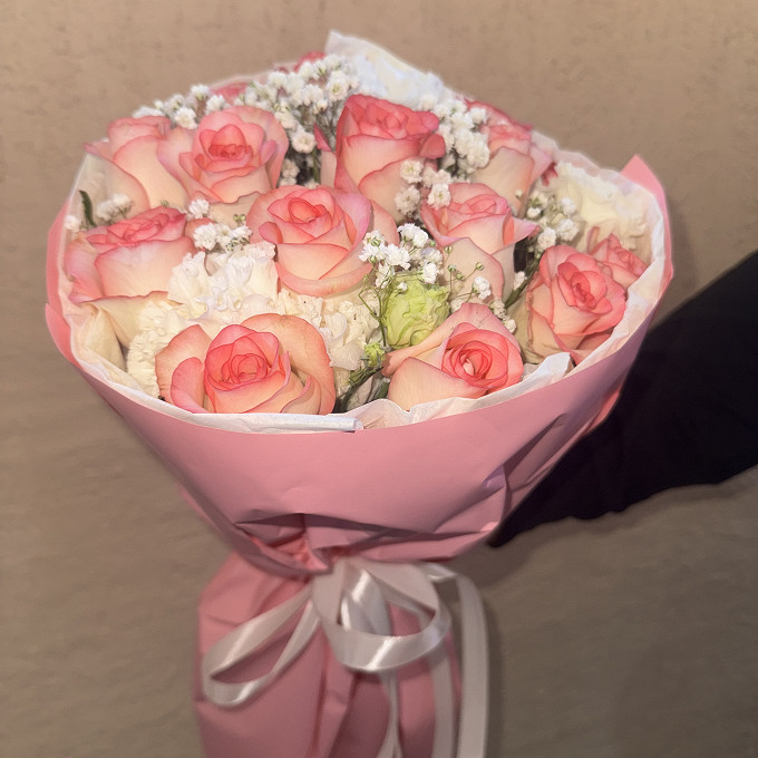 25 нежно-розовых роз Кения, 50 см в бирюзовой матовой плёнке