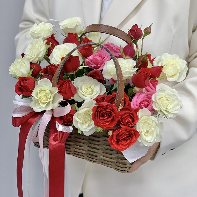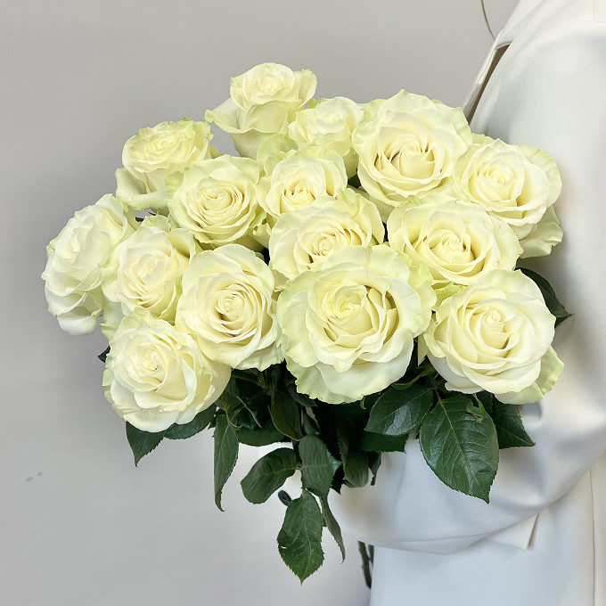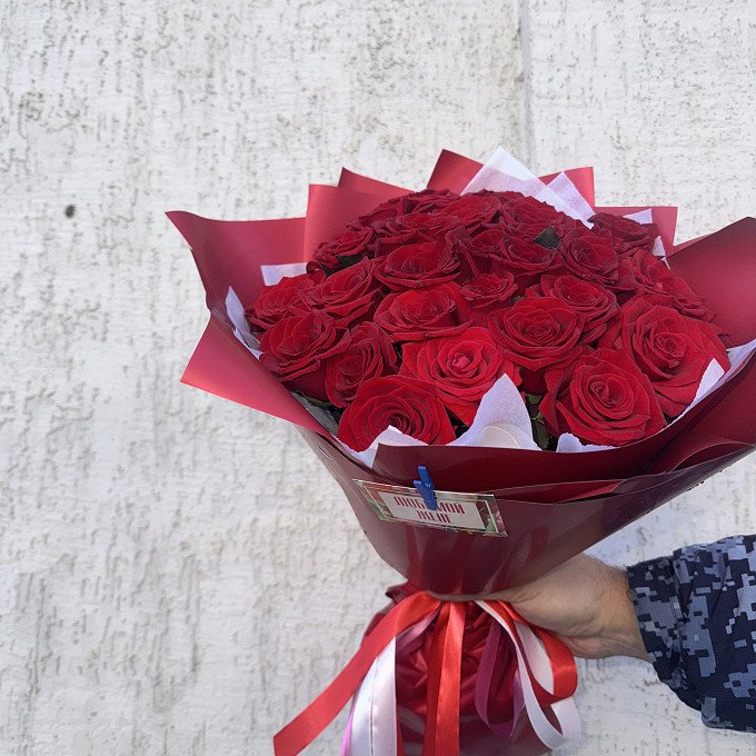 25 белых роз Кения, 50 см в красной матовой плёнке